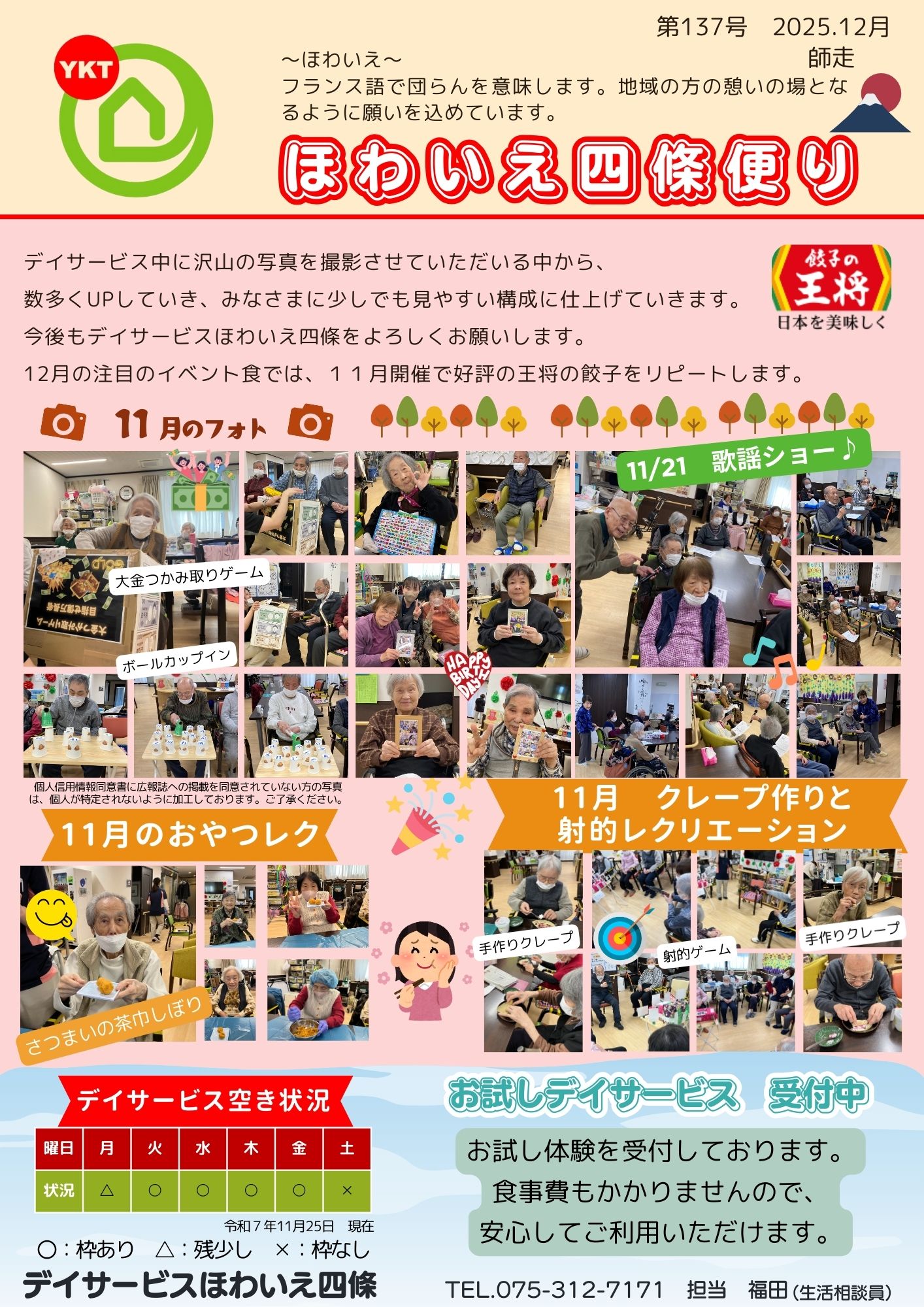 ほわいえ四條は、一日30名以下の少人数制。安心して過ごして頂けるようスタッフがひとりひとりのお悩みや思いに寄り添いながらケアを行います。