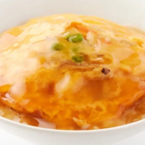 ふんわり卵に甘酢あんをかけた天津飯と、旨味たっぷりの中華スープの組み合わせです。