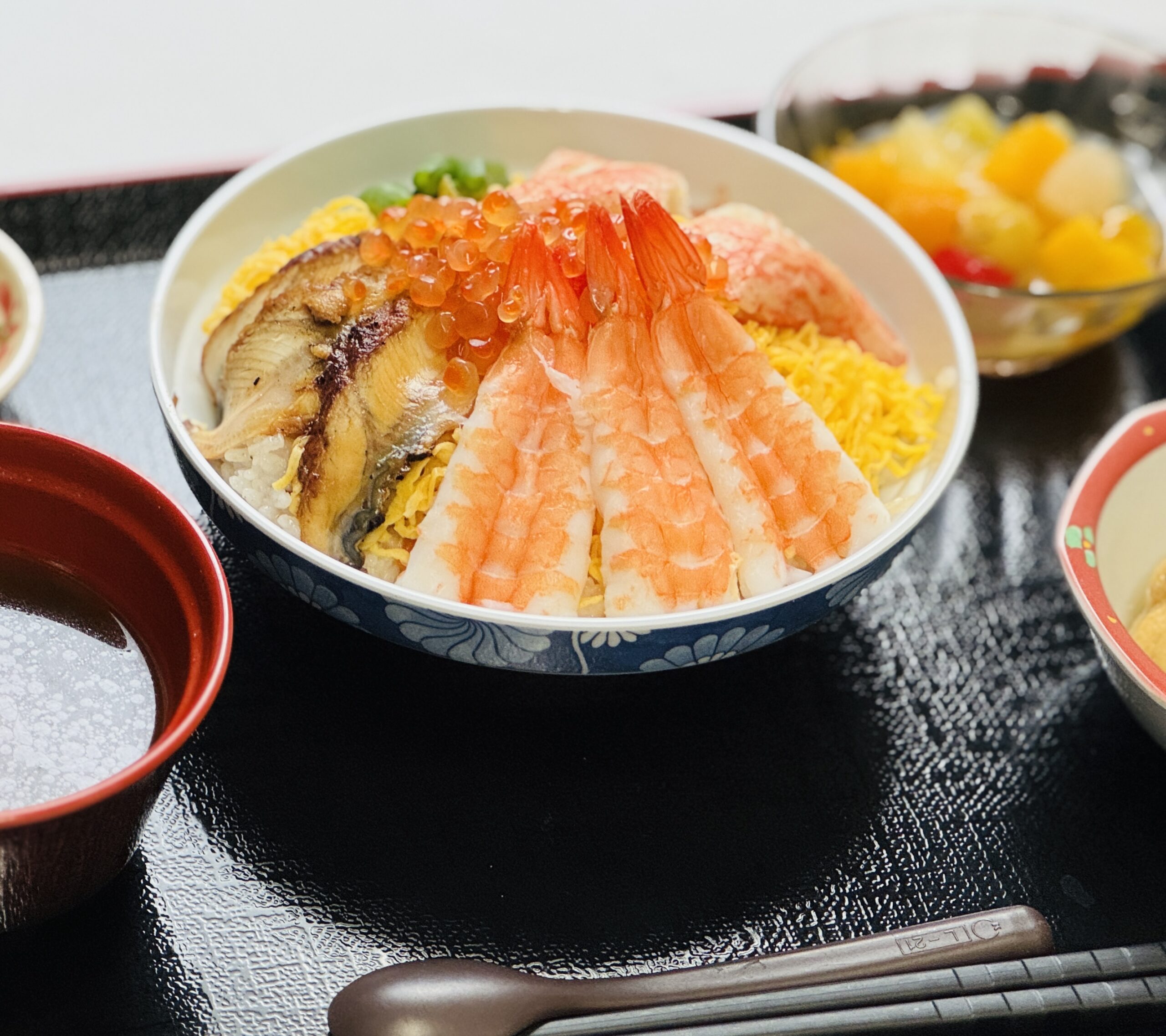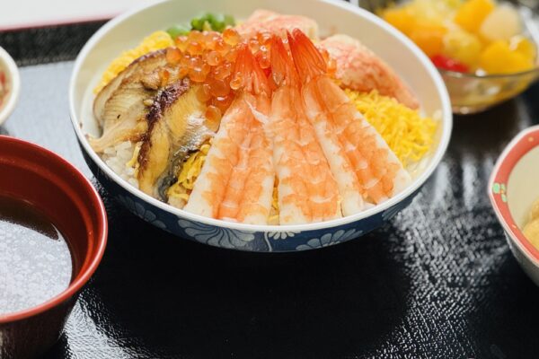 彩り豊かな具材が踊るちらし寿司。旬の味覚を添えた、目にも美味しい華やかな御膳です。